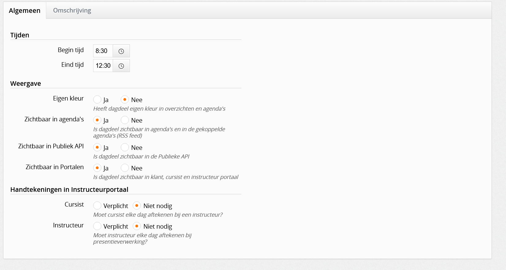 Ieder dagdeel dat je toevoegt aan een cursus(sjabloon) kan enkele instellingen hebben. Denk hierbij aan: