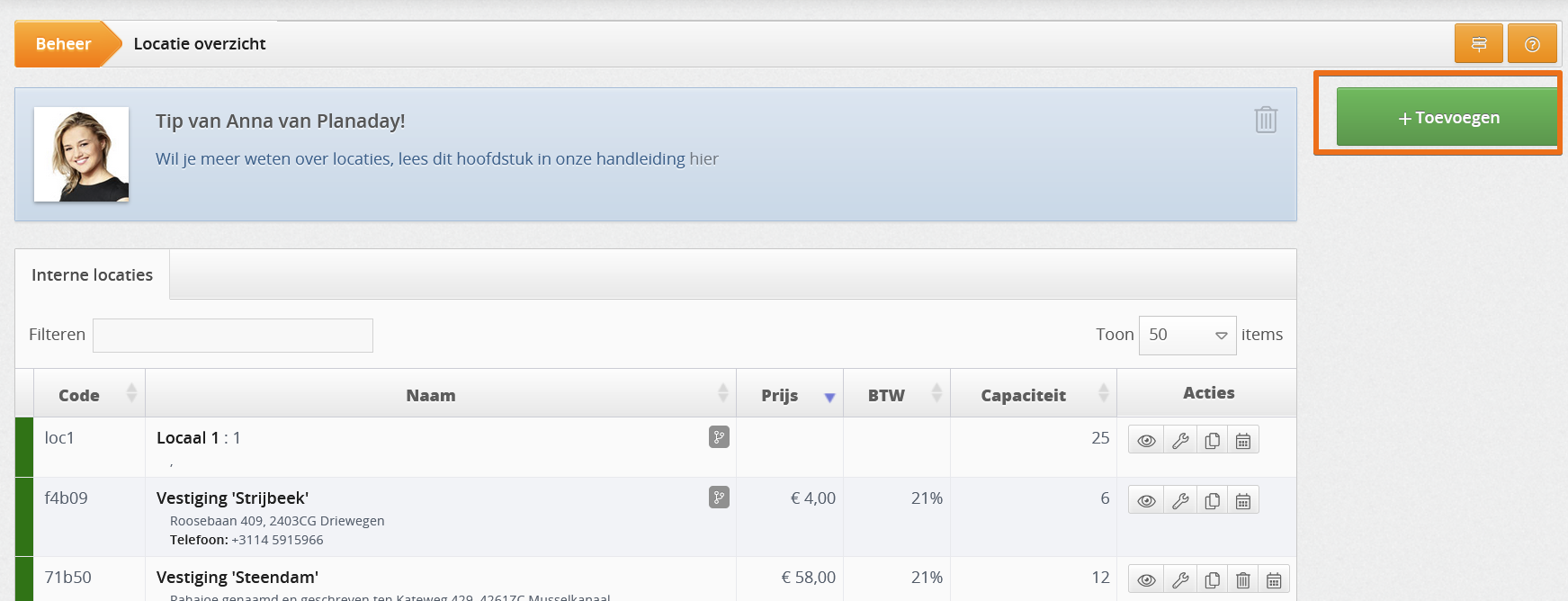 Weetje: Je hebt tenminste 1 locatie nodig in Planaday. Dit is waarop je dadelijk een cursus gaat inplannen. Dat kan intern of extern zijn. Een lokaal oid.
