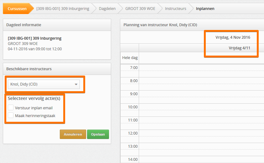 Zodra instructeur is ingepland kom je terug bij de cursus en kun je de overige zaken inplannen. Deze staan in het gele blok.