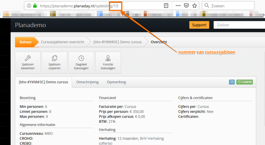 Als je 1 soort cursus(sjabloon) (bijvoorbeeld alle bhv-opleidingen) wil tonen op een pagina, dan is dat ook mogelijk. Breid de url uit met de cijfer van cursussjabloon. Bijvoorbeeld https://{planadayurl}/publiek/cursusoverzicht/1. Het nummer van cursussjabloon vind je terug bij cursussjablonen 1).