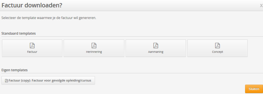 Print de factuur netjes door op de button Factuur downloaden te klikken. Hierna krijg je in een popup een keuze. Na de keuze te hebben bevestigd kun je 'm in de browser downloaden en printen.