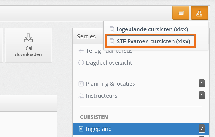 Ga hiervoor naar de ingeplande cursus en kies dan het dagdeel die de cursisten bevat welke je wil aanmelden. Kies vervolgens voor 'Ingepland' en kies dan rechtsboven bent voor het downloadicoon.