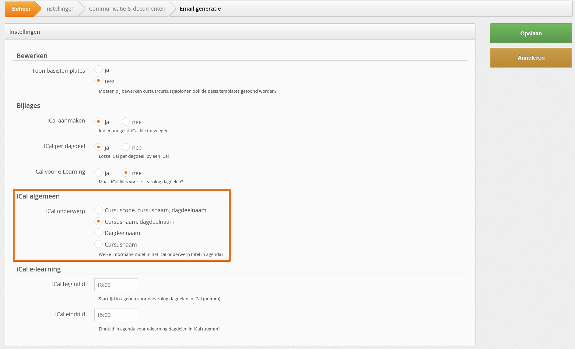 Indien je opgeeft dat je ook iCal wil meesturen voor E-learning, dan moet deze optie wel op 'Ja' staan. Pas dan ook bij voorkeur de begin en eindtijden aan onde.