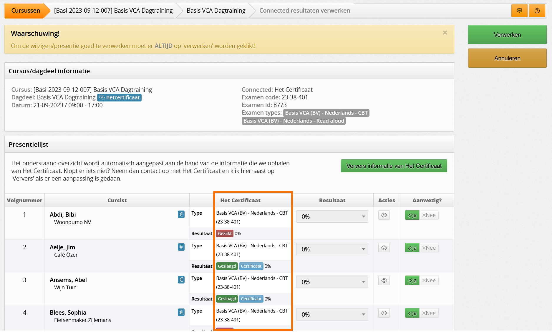 Als het cursussjabloon wordt ingepland als training wordt er ook gelijk een VCA examen aangemeld bij Het Certificaat.